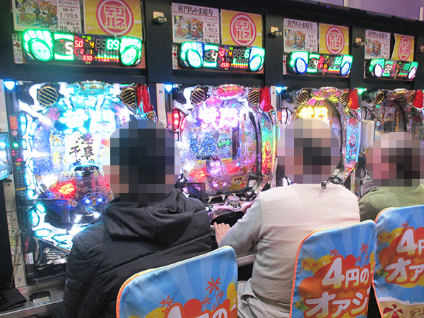 14時半ごろの4円パチンコでは、「CR黄門ちゃま超寿〜そこのけ もののけ 悪くじけ!〜 99.9ver.」など遊パチや「CR緋弾のアリアⅡ」などで、機種のポテンシャルを上手く引き出したプレイヤーを多数目にしている。