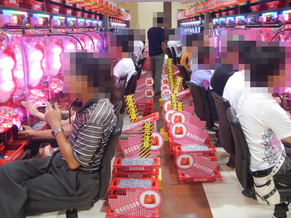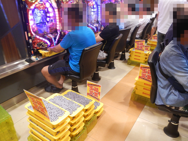 1円パチンコや5円パチスロといった低貸し玉コーナーで、もっとも目立っていたのは1円パチンコの玉箱営業コーナー。