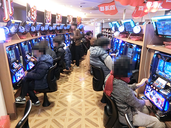 取材日も開店前から250名ものプレイヤーが集合。各人、遊技ができるのを心待ちにしながら開店時刻を待ちわびていた。