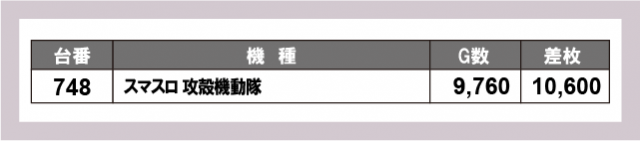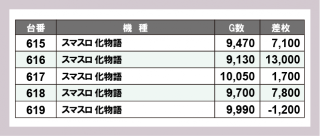 また機種別に目を向けると、『スマスロ 化物語』は5台中4台がプラス差枚を記録し、万回転超の稼働を伴って好調ぶりを披露。機種単位で手応えを感じられる展開となったほか、メダル機やバラエティまで多彩な機種から好調台が生まれ、終日高い盛り上がりを感じられる一日となっていた。