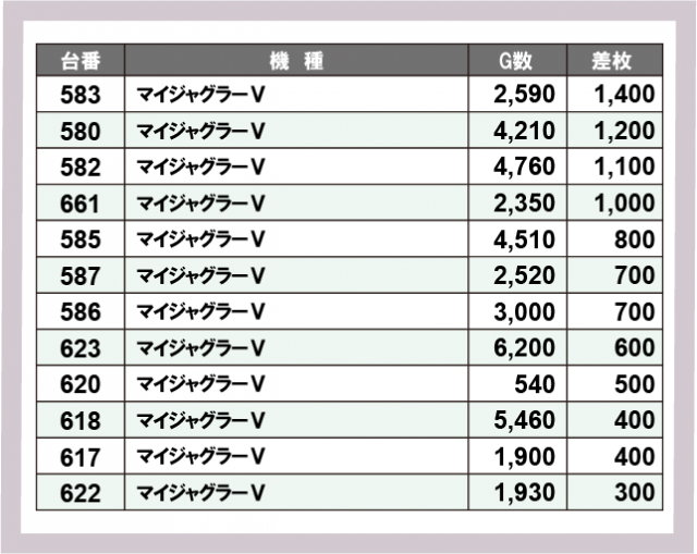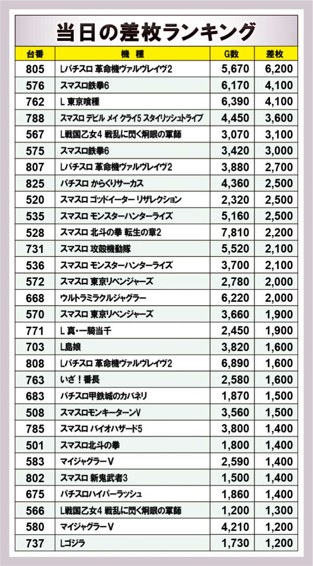 ※差枚数順に掲載しています