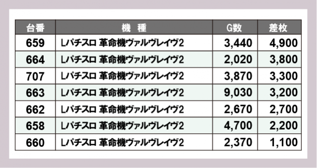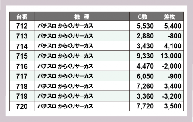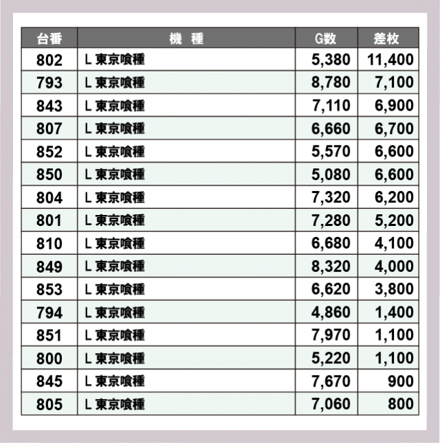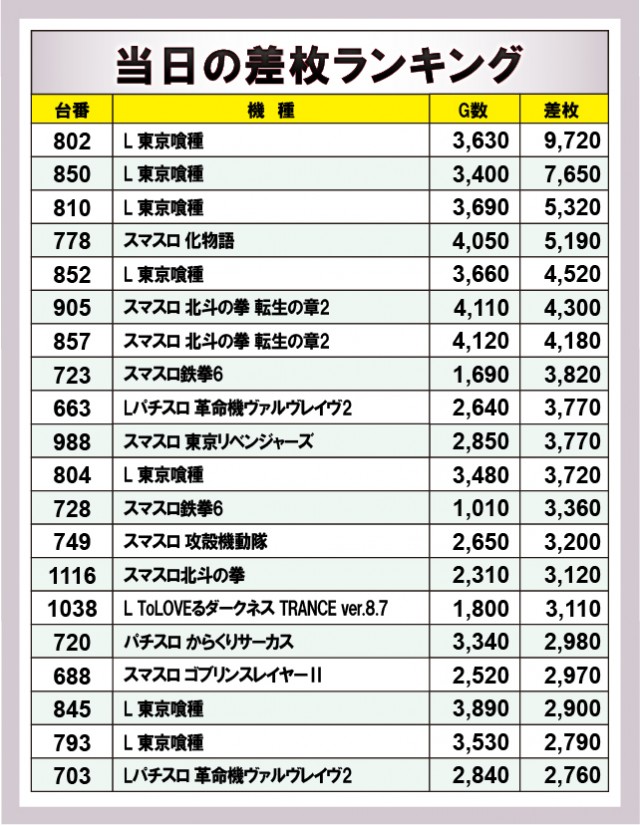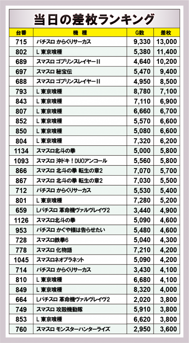 ※差枚数順に掲載しています