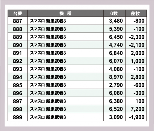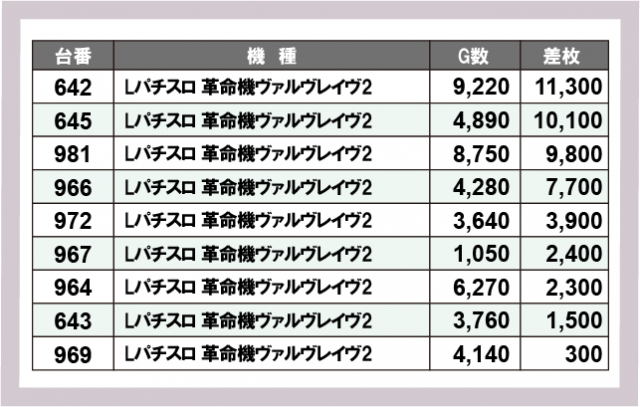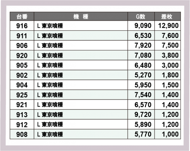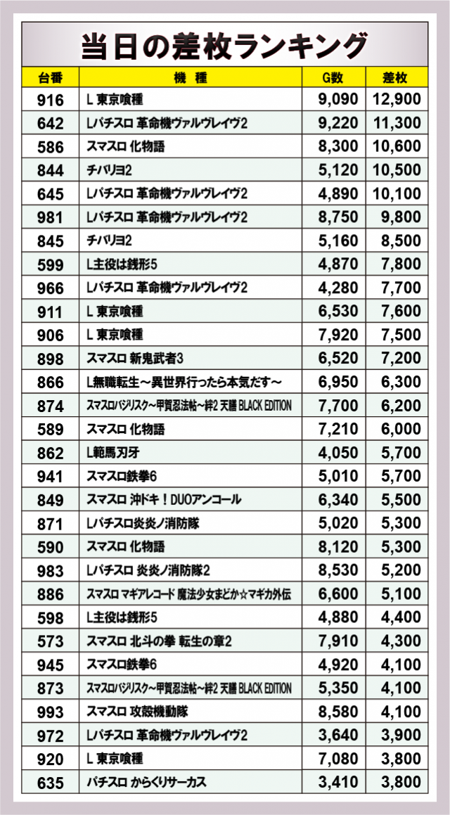 ※差枚数順に掲載しています