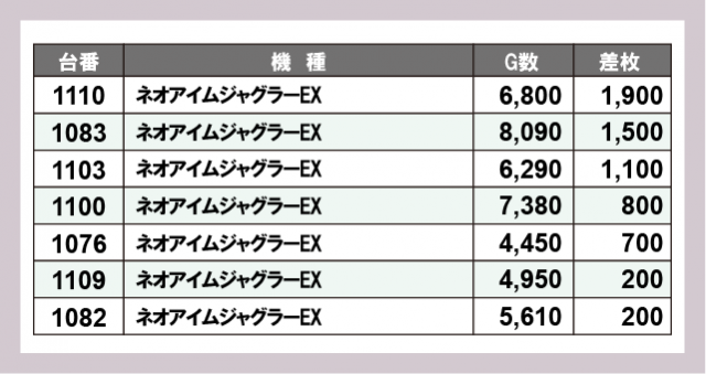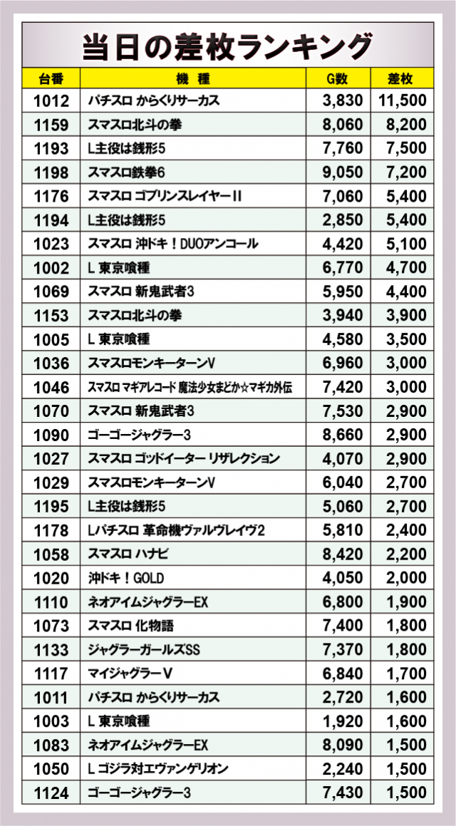 ※差枚数順に掲載しています