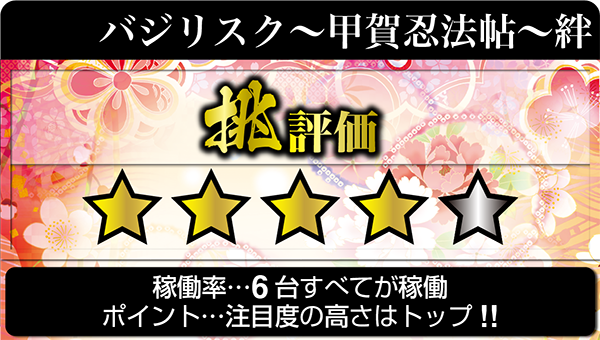 たくさんのプレイヤーが集まり、明るい表情で遊技を楽しんでいた「ニュー後楽園JR千葉西口店」。「バジリスク~甲賀忍法帖~絆」をはじめ、さまざまな機種が盛り上がっている印象を受けた1日であった。
