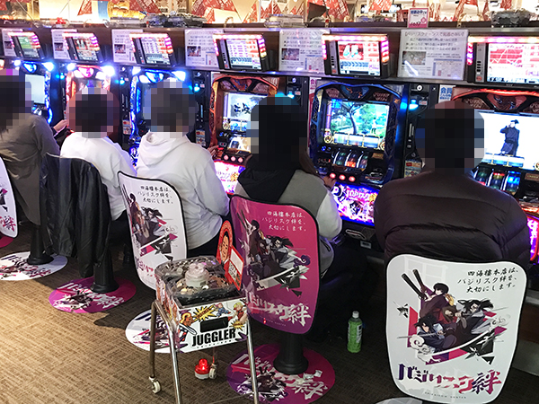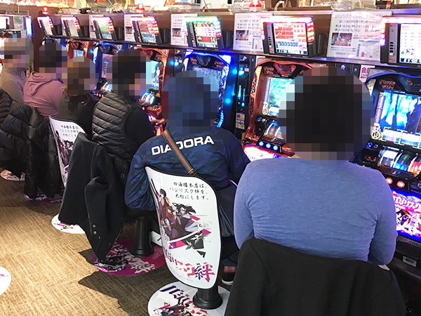 開店直後は20円パチスロが大人気。「バジリスク~甲賀忍法帖~絆」をはじめとしたAT・ART機が瞬く間に満席となっていた。