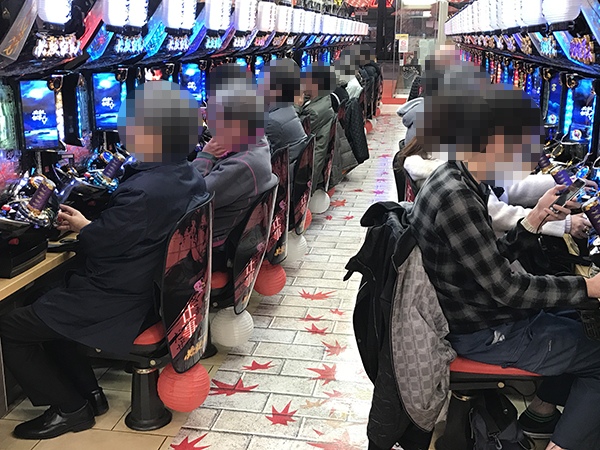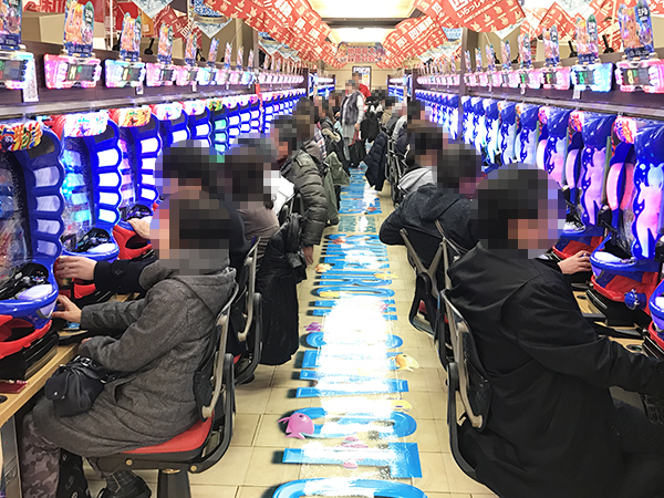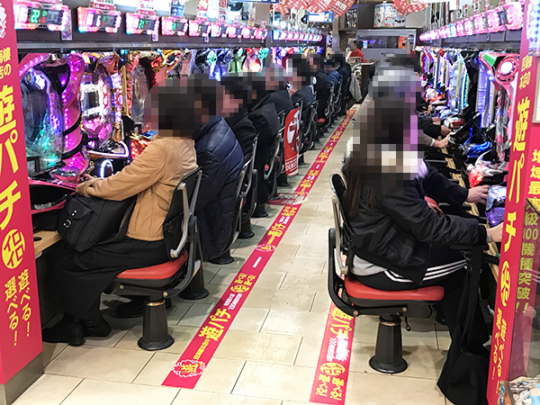 19時過ぎの4円パチンコを見ると、「CRぱちんこ必殺仕事人Ⅴ」や「CR大海物語4」、「CRヱヴァンゲリヲン 2018年モデル」などが活況で、シマ全体がプレイヤーの熱気に包まれていた。