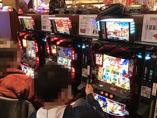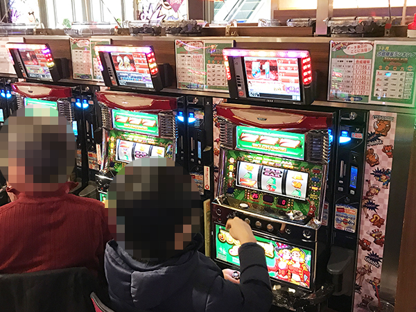 「ジャグラーガールズ」や「スーパーミラクルジャグラー」、「ニューパルサーSPⅡ」などのボーナスタイプも盛況。プレイヤーたちの嬉しそうな表情を目にしている。