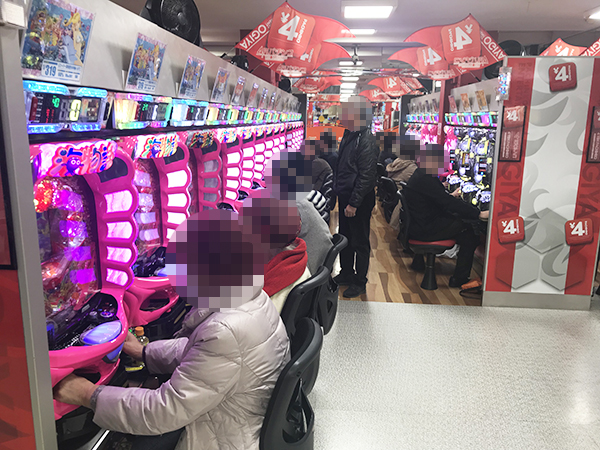 17時過ぎの4円パチンコでは、「CRスーパー海物語IN沖縄4」をはじめとした海物語シリーズが大人気。機種の性能をフルに活かしているプレイヤーであふれ、シマ全体が活気に満ちていた。