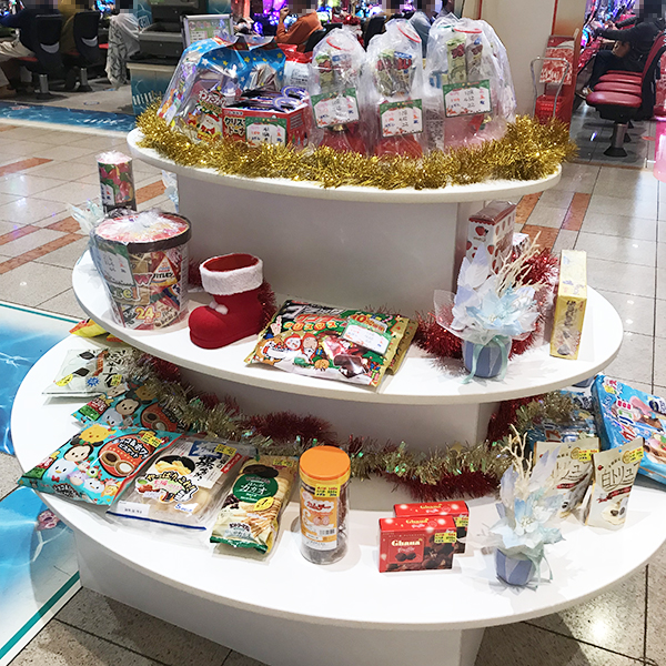 クリスマスが近いとあって、景品コーナーは子どもが喜びそうな菓子類が豊富に揃えられている。さらにレストスペースは開放感があふれ、大勢が休息できるようイスやテーブルが幾つも用意されているなど設備面も優秀。