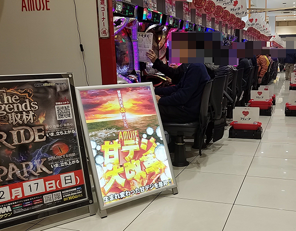 「The Legends取材-PRIDE」の舞台となったのは、パチンコとパチスロをあわせて720台が設置されている「アミューズ吹田岸辺店」。ひざかけの貸し出しやフリーWi-Fiの完備など、サービスが充実していることも魅力的なホールだ。