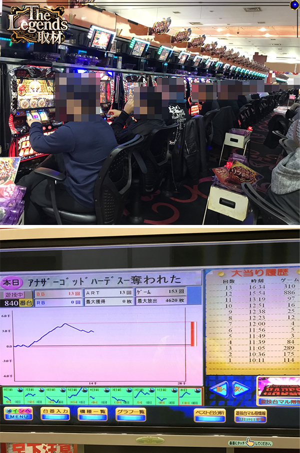 出玉…4箱アリ。2箱アリ(2台)。1箱アリ。最大4620枚獲得