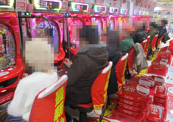 4円パチンコにおいて、とくに盛り上がっていたのが新台の「CR真・花の慶次2」。稼働率の高さやうれしそうに遊技をおこなうプレイヤーたちの姿など、多くの面から厚く支持されていることが伝わってきた。