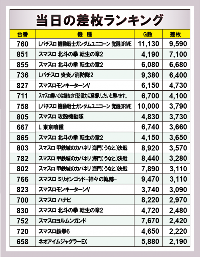 新台『Lパチスロ 機動戦士ガンダムユニコーン 覚醒DRIVE』が+9,590枚でトップを獲得し、万枚に届くか否やの強烈なインパクトを披露。続く『スマスロ 北斗の拳 転生の章2』も+7,100枚・+6,680枚と複数ランクインを果たし、主力機種としての存在感を存分に発揮していた。さらに『Lパチスロ 炎炎ノ消防隊2』『スマスロモンキーターンV』『スマスロ 甲鉄城のカバネリ 海門(うなと)決戦』といった人気機種も名を連ね、+3,000枚OVERも広く分布。フロア全体でチャンスが感じられるランキングとなっていた。