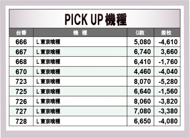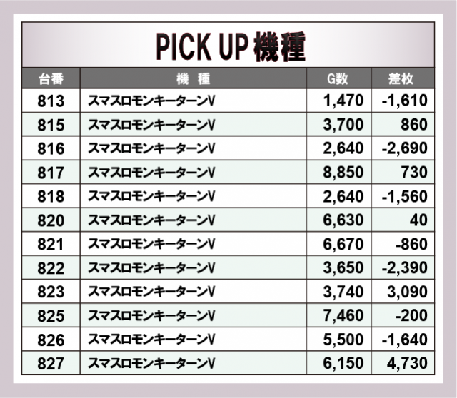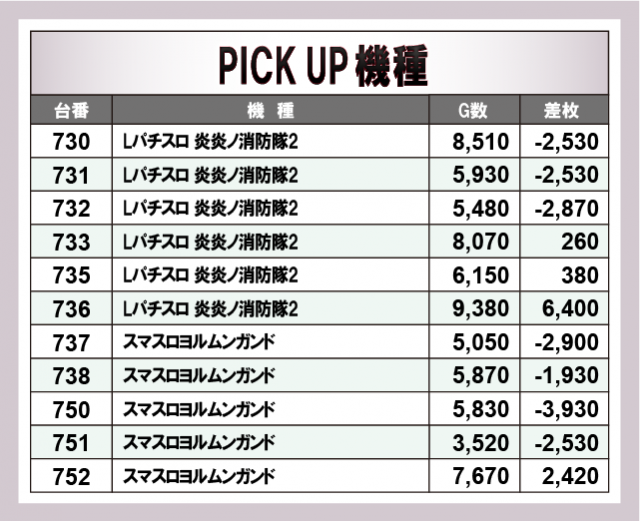 PICK UP機種では、『L 東京喰種』は全体的に苦戦気味ながらも、一部ではしっかりと差枚を伸ばす台が確認される結果に。高稼働の状況からも、掴めば伸びるポテンシャルは十分に感じられる。『Lパチスロ 炎炎ノ消防隊2』『スマスロヨルムンガンド』はマイナス台を含みつつも、+6,400枚を筆頭に見せ場を構築し、メリハリのある挙動を披露。また『スマスロモンキーターンV』も+4,730枚をはじめ複数台でプラス差枚を記録しており、機種単位での強さを感じさせる結果となっていた。