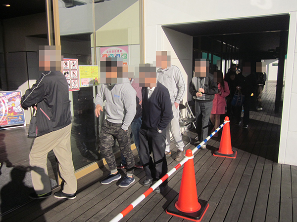 取材日は開店前から70名のプレイヤーが集まり、「バジリスク~甲賀忍法帖~絆」や「ミリオンゴッド‐神々の凱旋‐」、「押忍!番長3」が続々と満台となるなど、朝から活気ある状況であった。