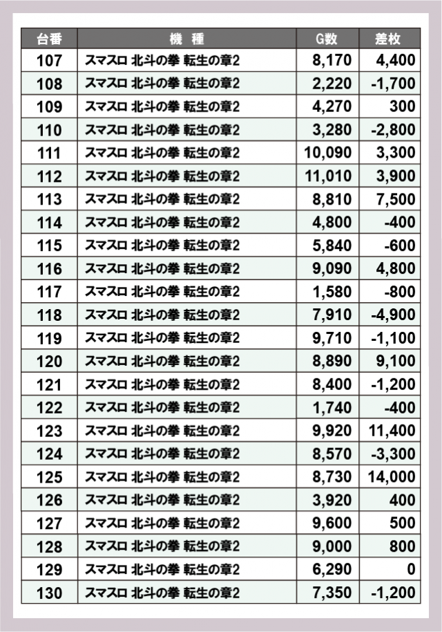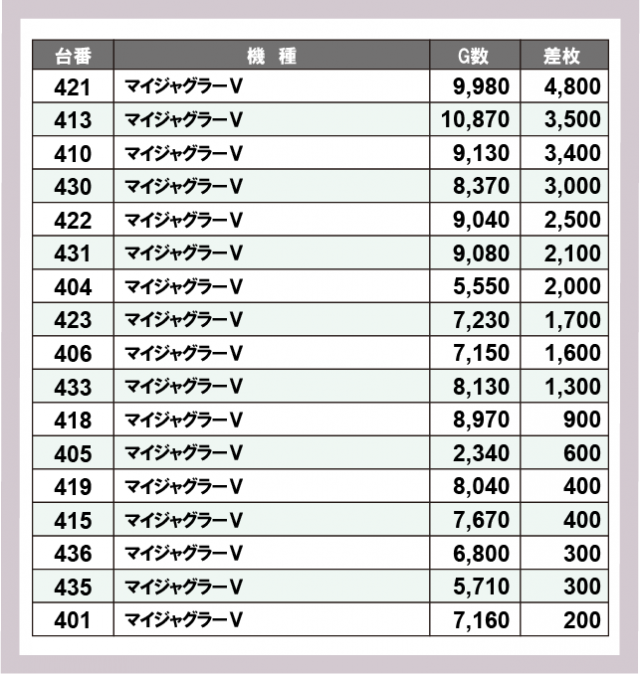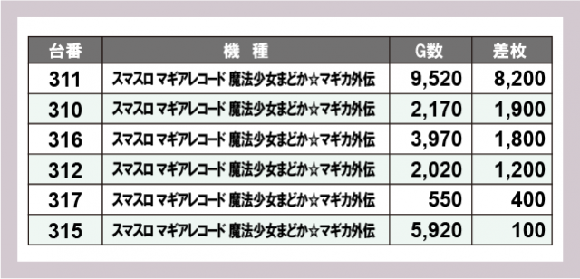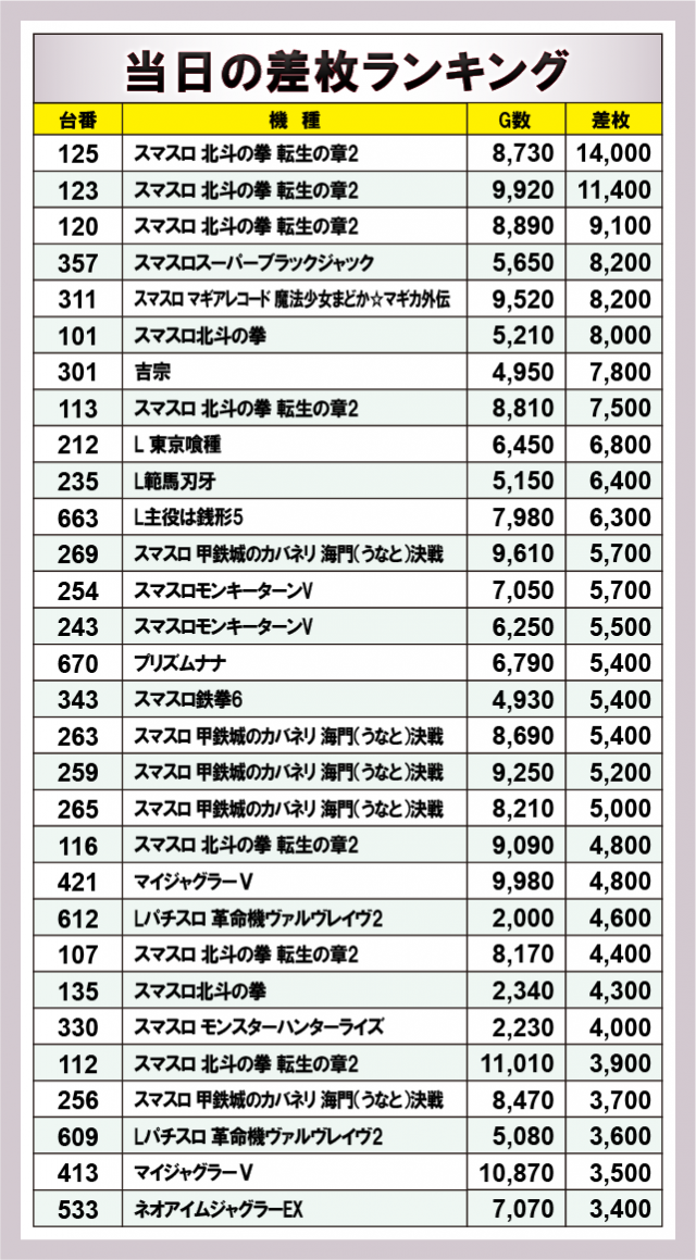 ※差枚数順に掲載しています