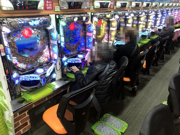 4円パチンコでは海物語シリーズが人気。「CRスーパー海物語IN JAPAN 319バージョン」をはじめとしたミドルタイプから、「CRAスーパー海物語IN沖縄3 ASB」や「CRAスーパー海物語 IN JAPAN with 桃太郎電鉄」といった遊パチまで、スペックを問わず様々な機種が楽しまれていた。女性プレイヤーの姿も多く見られ、華やかな雰囲気が感じられた。