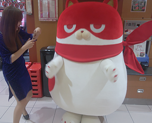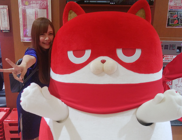 ももちゃんとツーショット撮影をしているのは、マルハンさんのイメージキャラクター・にゃんまる。