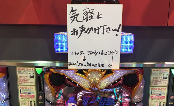 大きな色紙を台の上に掲げ、自己アピールをバッチリと決めつつ「ぱちんこCR北斗の拳7 転生」でチャレンジ開始!