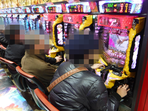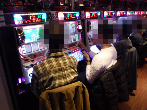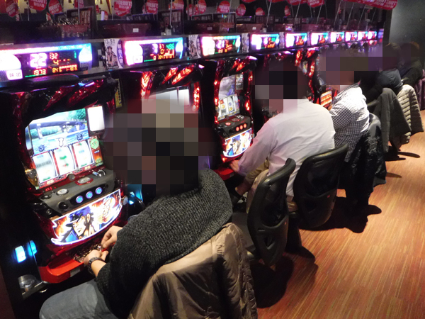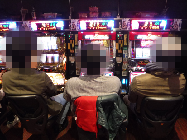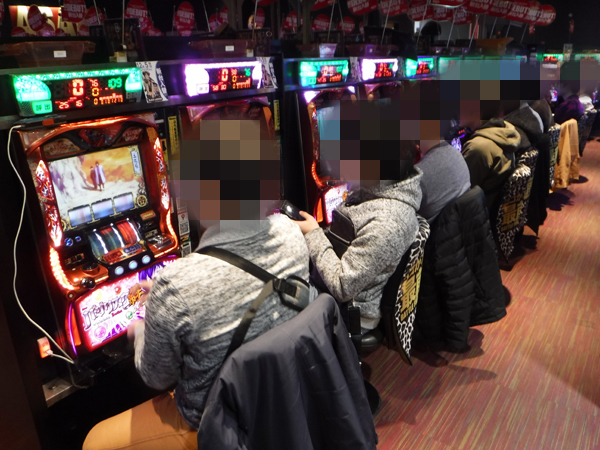 開店直後の店内を見てみると、パチスロコーナーの「バジリスク~甲賀忍法帖~絆」や「押忍!番長3」などが早々に満席状態。