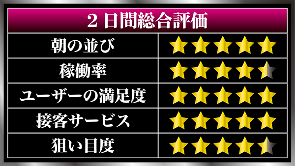 さらに、スタッフの明るい笑顔や機敏な接客をする姿も目撃。多くの設置台数、多くのプレイヤーが遊技を楽しんでいるなかでも、待たされているプレイヤーは少なかったように思える。こういった点もこのホールの魅力の1つではないだろうか。