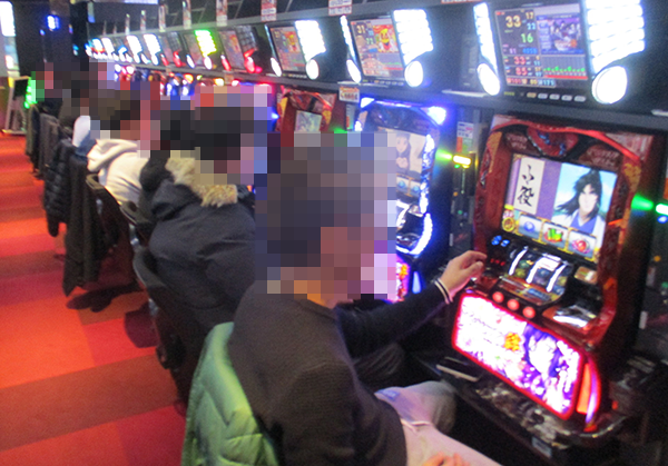 午後のパチスロでは、「バジリスク~甲賀忍法帖~絆」や「押忍!番長3」が盛況。華やかなシーンがあちこちでみられた。