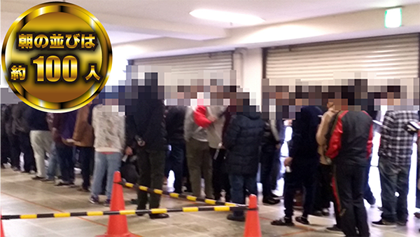 12月26日の開店前に並んでいたパチスロファンは約100名。14時頃には朝イチ以上に稼働率も高くなり、あらゆる場所に華やかな光景が広がっていた。