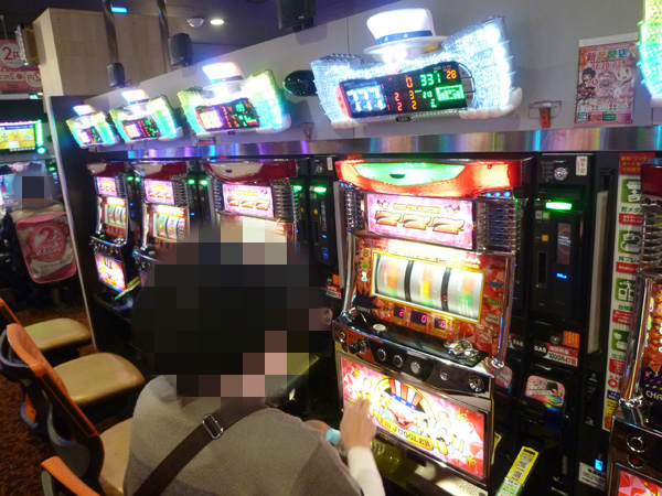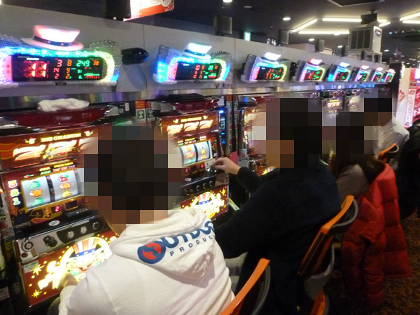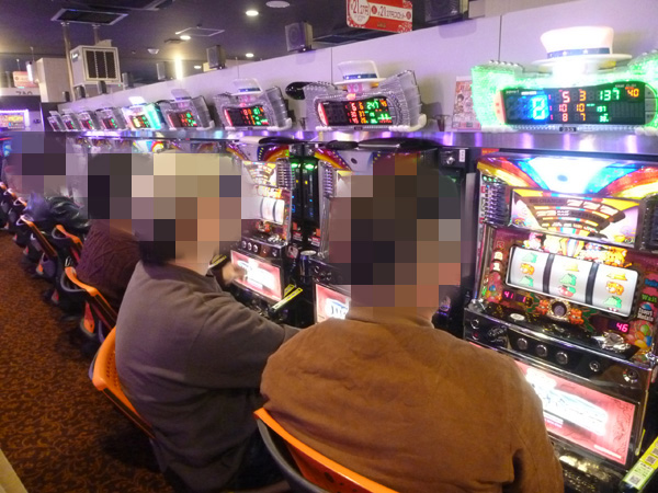 14時半頃の1000円/47枚パチスロでは、ジャグラーシリーズが安定の人気ぶり。プレイヤーたちの嬉しそうな笑顔が、心から楽しめていることをあらわしているようであった。