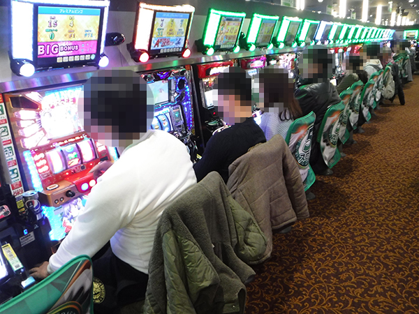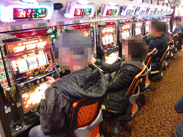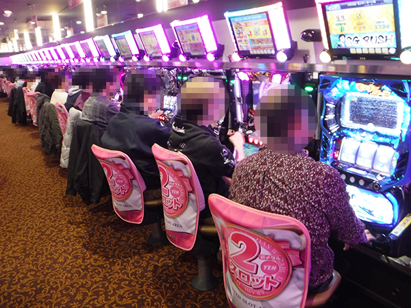 2円パチスロも空き台が見当たらないほどの高稼働。様々な機種が活気づいており、プレイヤーたちの笑顔からも、心から遊技を楽しめていたことがうかがえる。