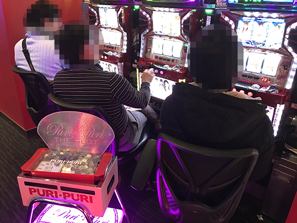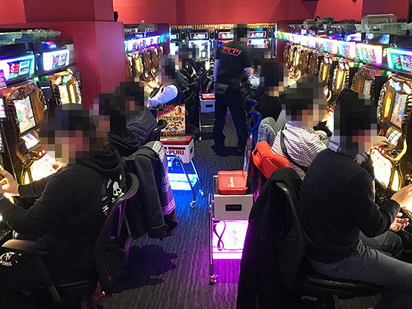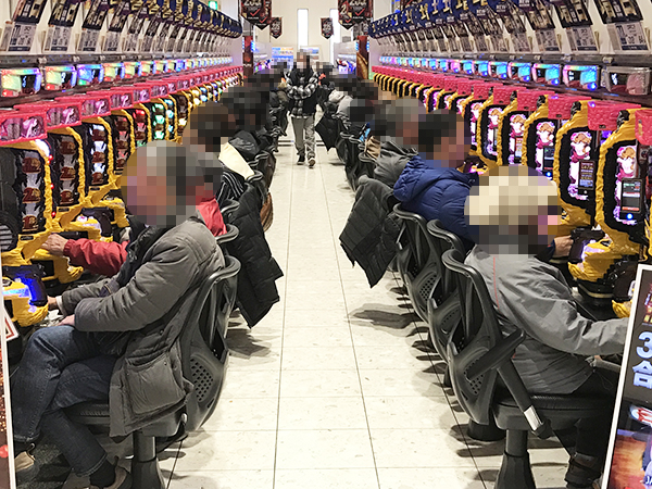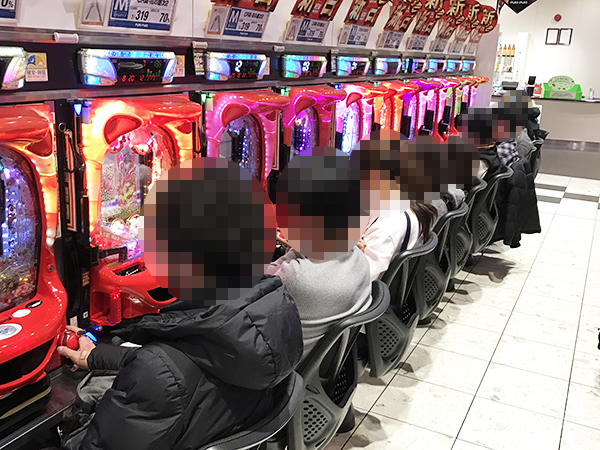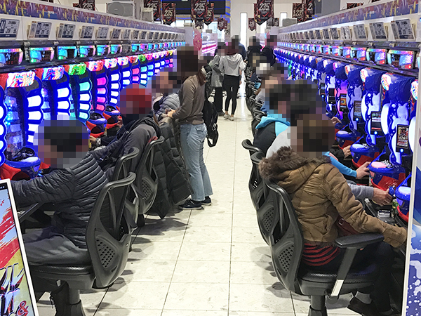取材日の店内には、多くのプレイヤーが来店。パチンコ・パチスロ共に、様々な機種が支持を集めていた。