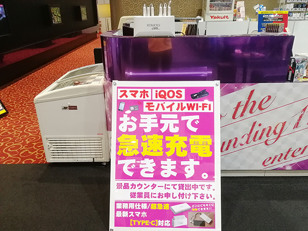 景品カウンターでは急速充電器を無料貸し出ししており、多くのプレイヤーから好評のようだ。