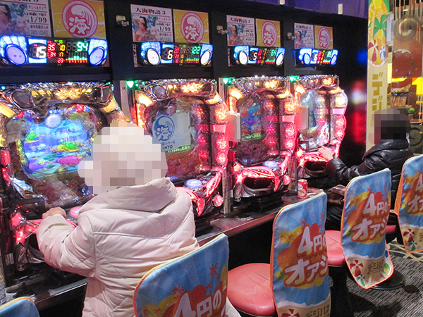 16時半ごろに4円パチンコをチェックすると、「CRA大海物語3Withアグネス・ラム」や「CR黄門ちゃま〜神盛JUDGEMENT〜」などで、機種の魅力を存分に味わっているプレイヤーたちを確認。遊技中に見せる、嬉しそうな表情が印象に残っている。