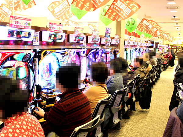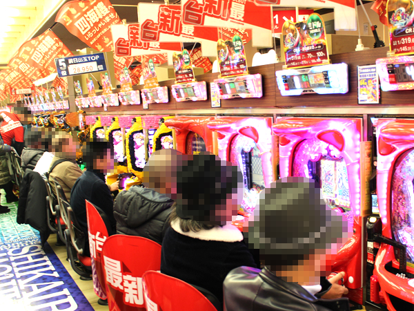 15時頃の4円パチンココーナーでは、「CR真・花の慶次2」や「CRフィーバー機動戦士Zガンダム」が活況の様子。活躍をみせるプレイヤーによって、シマ内に広がる雰囲気は明るいものとなっていた。