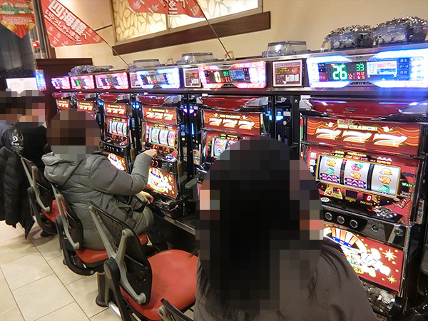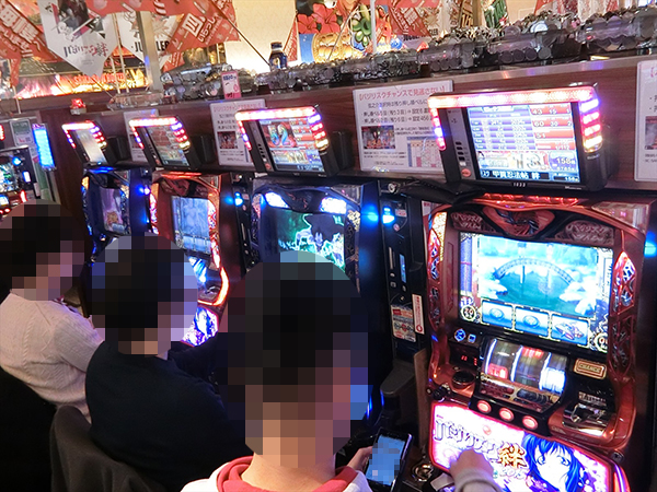 20円パチスロに目を向けると、朝から人気の「バジリスク~甲賀忍法帖~絆」がひときわ盛況。「押忍!番長3」も好評で、プレイヤーたちの表情も実にイキイキとしていた。