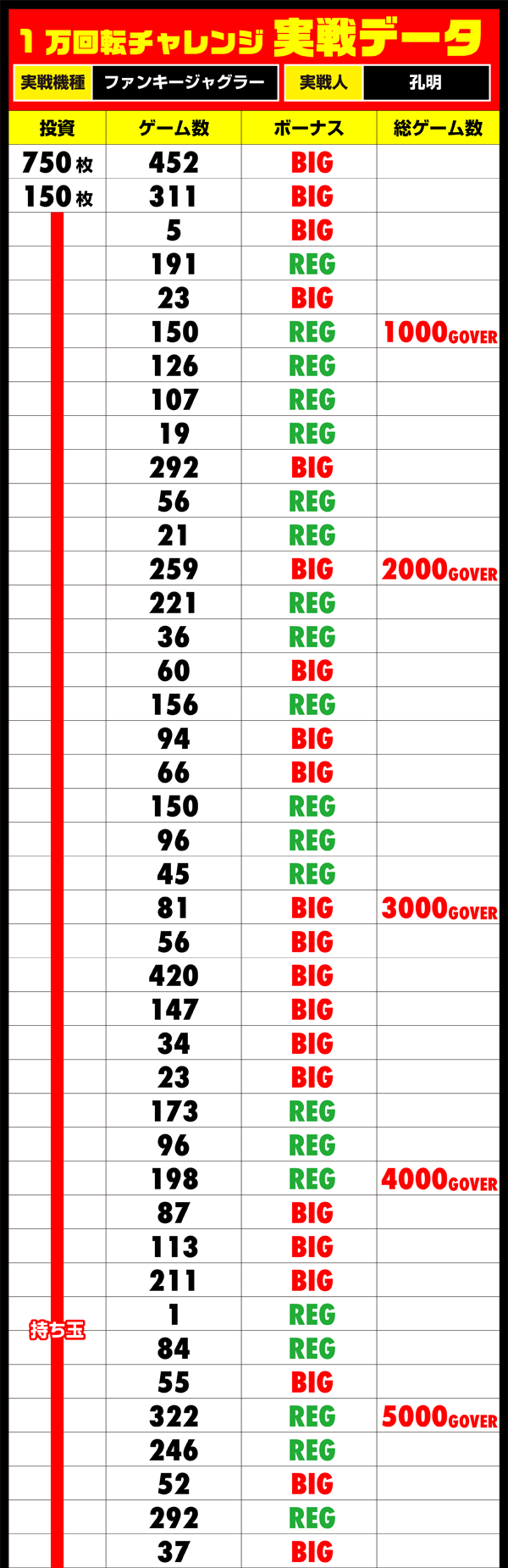 チャレンジ失敗にくわえて、最後にみせたヒキの弱さによって差枚もマイナスと中途半端な結果を残す孔明であった。