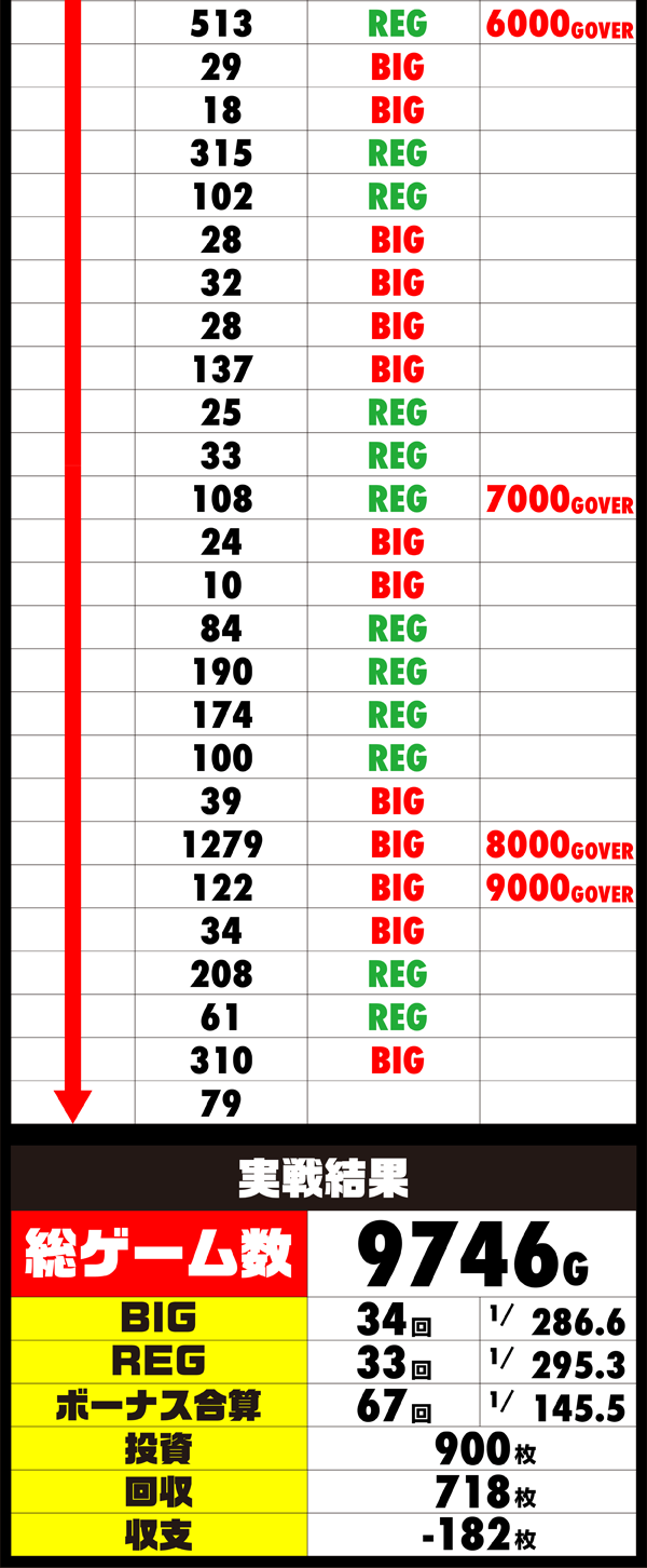 トータルのボーナス回数が多いものの、BIGとREGをバランスよく獲得と展開は悪くない。