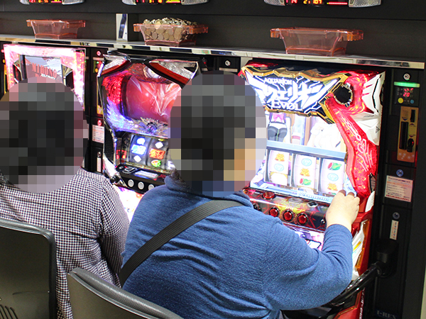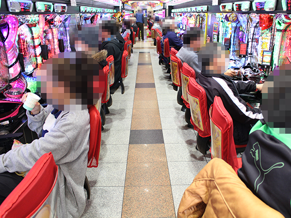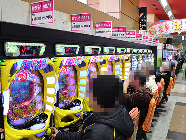 取材時、店内には既に多くのプレイヤーが集結しており、パチンコ・パチスロを問わずにぎやかな状況となっていた。