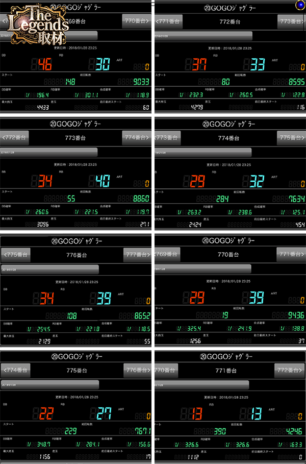 BIG46回/REG30回(ボーナス合算確率1/118)/最大4433枚獲得。BIG37回/REG33回(ボーナス合算確率1/122)/最大4279枚獲得。BIG34回/REG40回(ボーナス合算確率1/119)/最大3096枚獲得。BIG29回/REG32回(ボーナス合算確率1/125)/最大2424枚獲得。BIG34回/REG39回(ボーナス合算確率1/118)/最大2129枚獲得。BIG29回/REG39回(ボーナス合算確率1/138)/最大1256枚獲得。BIG22回/REG27回(ボーナス合算確率1/156)/最大1156枚獲得。BIG13回/REG13回(ボーナス合算確率1/163)/最大1112枚獲得