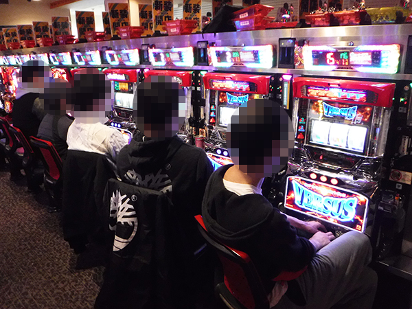 ジャグラーシリーズや「バーサス」などのボーナスタイプもにぎやかな状況。様々な機種でプレイヤーたちが遊技をおこなっており、中には華麗なパフォーマンスで注目を集めている姿もあった。