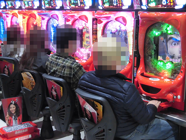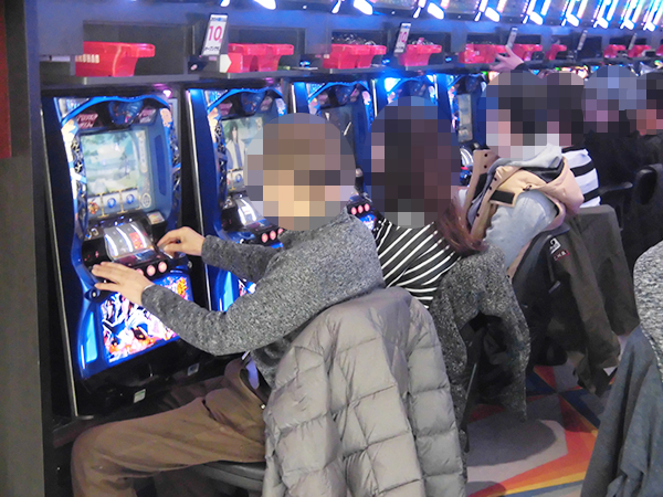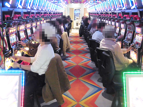 店内を覗くと、老若男女を問わず多くのプレイヤーが集合。パチンコ・パチスロの各シマからにぎわいが感じられた。