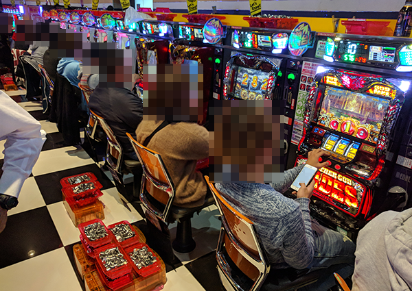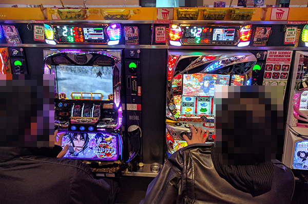 「盗忍!剛衛門」や「パチスロ コードギアス 反逆のルルーシュ」なども活気づいており、プレイヤーたちは満面の笑みを浮かべていた。