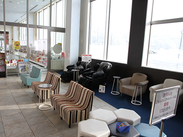 開放感抜群のレストスペースには、漫画本や雑誌、マッサージチェアも用意されていて、どんな時も充実した時間を過ごせそうだ。