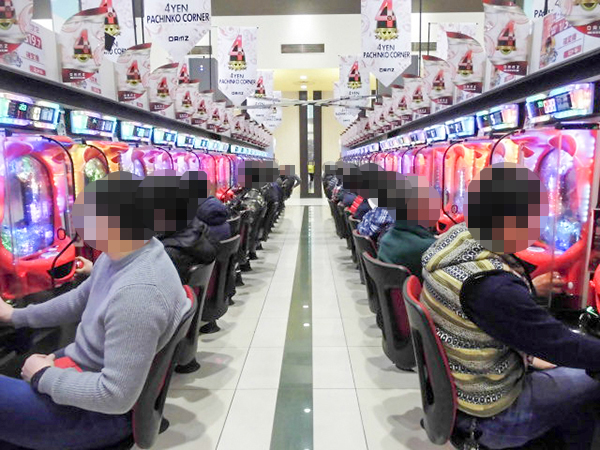 1円パチンコも全体的に稼働が高く、空き台を探すのがやっとという状況。特に海物語シリーズは盛況で、至る所で華やかなシーンを見ることができた。