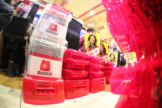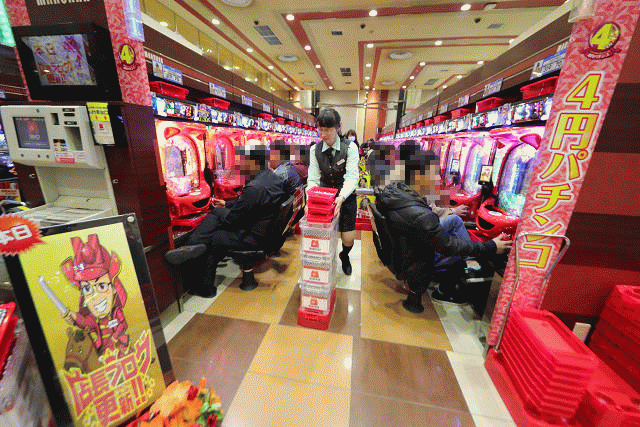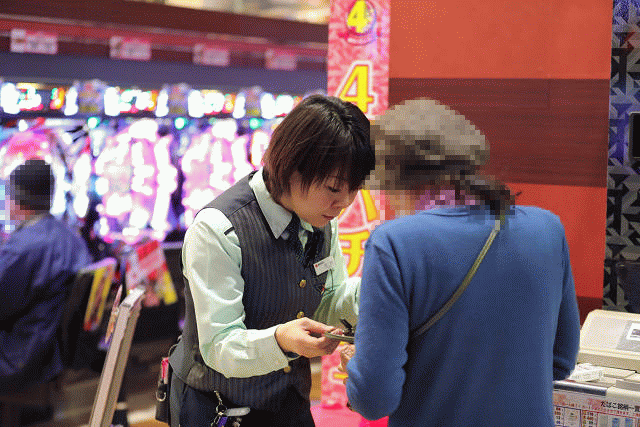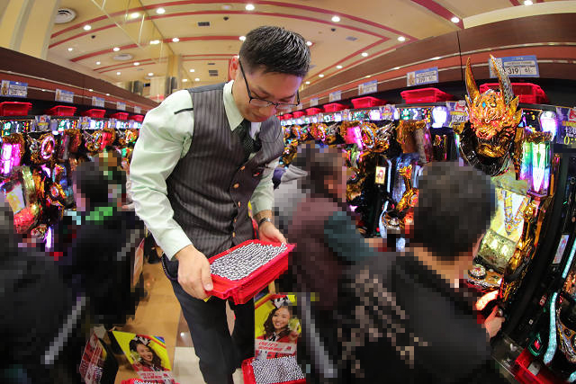 賑わう店内でもスタッフは絶えることない笑顔で玉箱のアートを築き、遊技に熱中するファンへエールを送る!