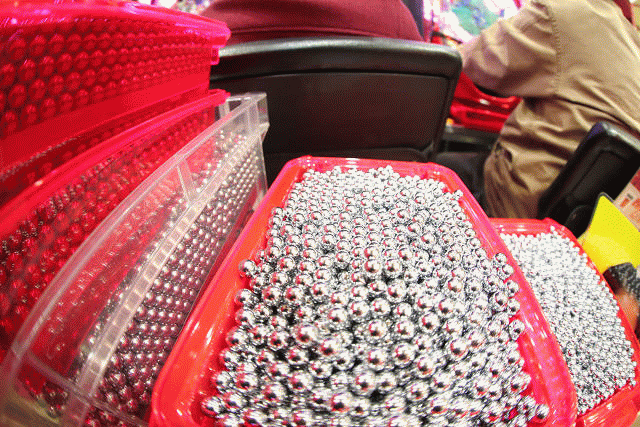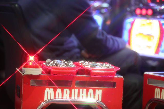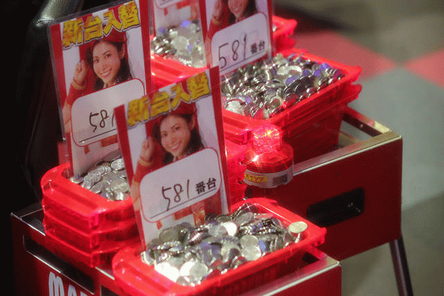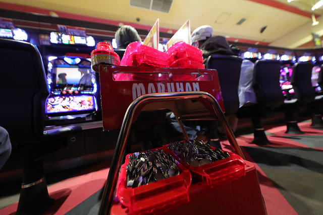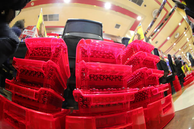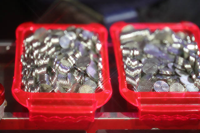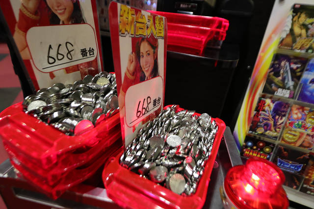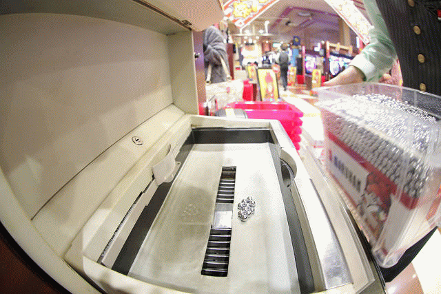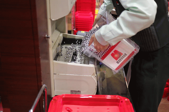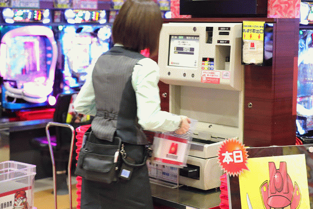 総重量?キログラムの玉箱・ドル箱を丁寧に計数するスタッフ。