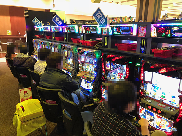 若年層から年配層まで幅広い年代が楽しんでいた5円パチスロも、空き台がないほどに高い稼働率をキープしていた。