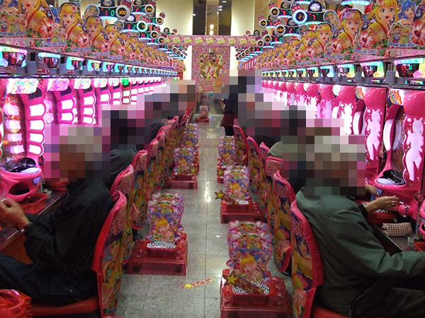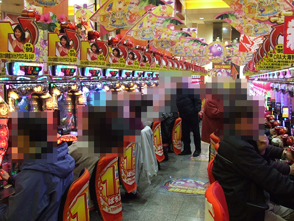 4円パチンコでは、新台の「CR真・花の慶次2」が大盛況。なかには、理想的な展開に笑みを浮かべるといったプレイヤーも確認している。