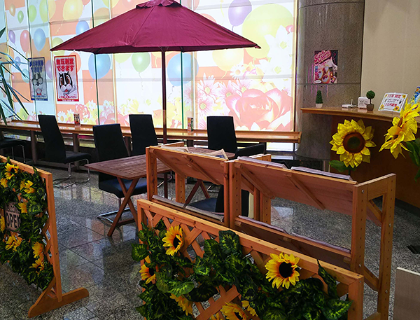 パラソルやひまわりが飾られているレストスペースがあり、この場所でならば心身ともにリラックスできると思えた。