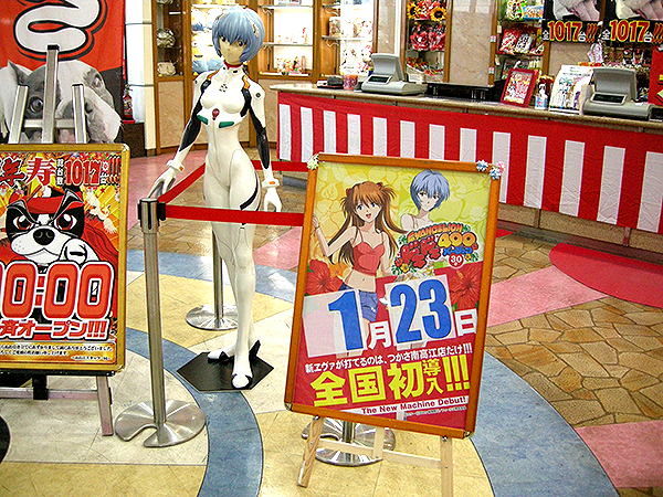 同店が1月23日に導入した「EVANGELION 30φMODEL」のPRのため、綾波レイの等身大人形が登場。最新の遊技台にプレイヤーの注目も高いようだ。